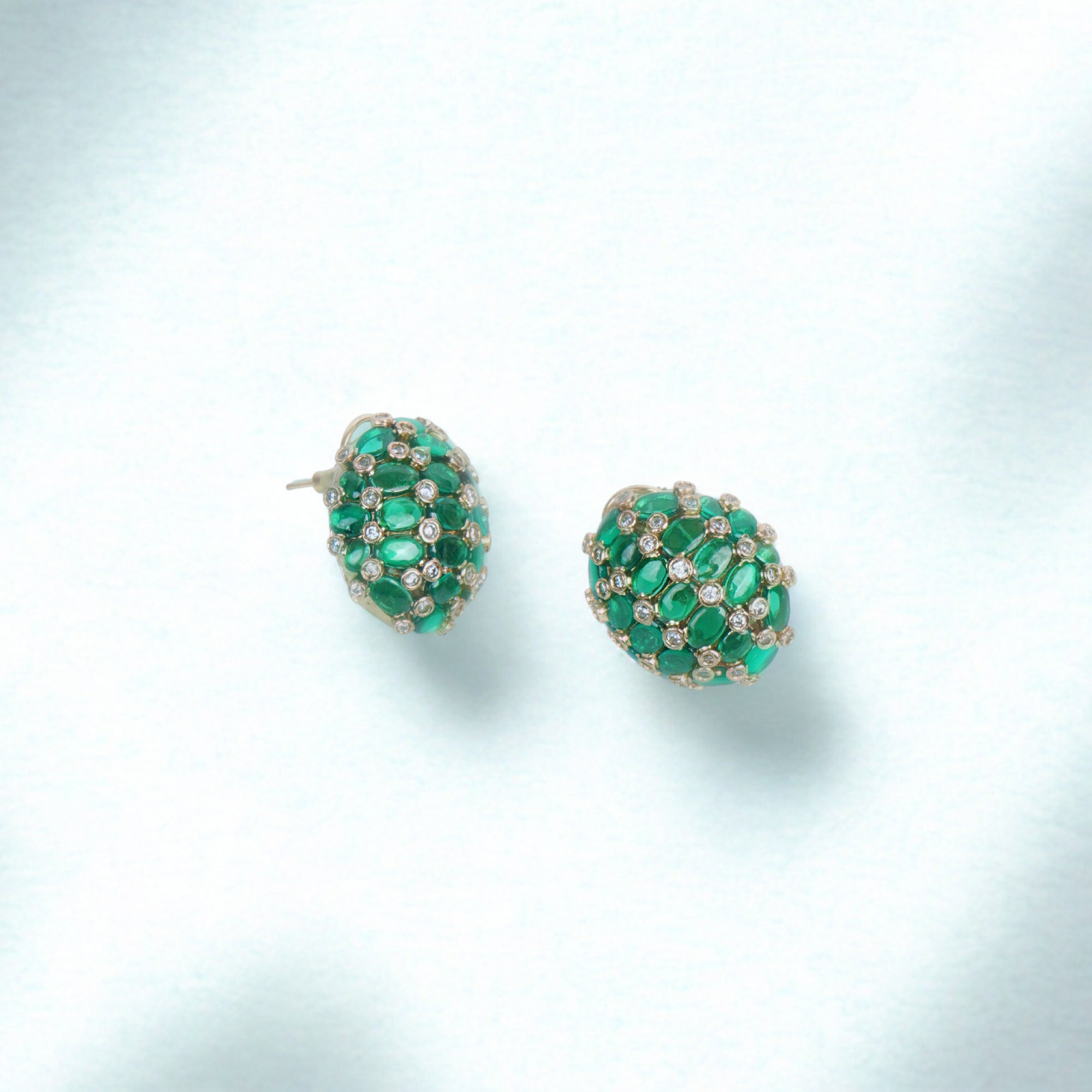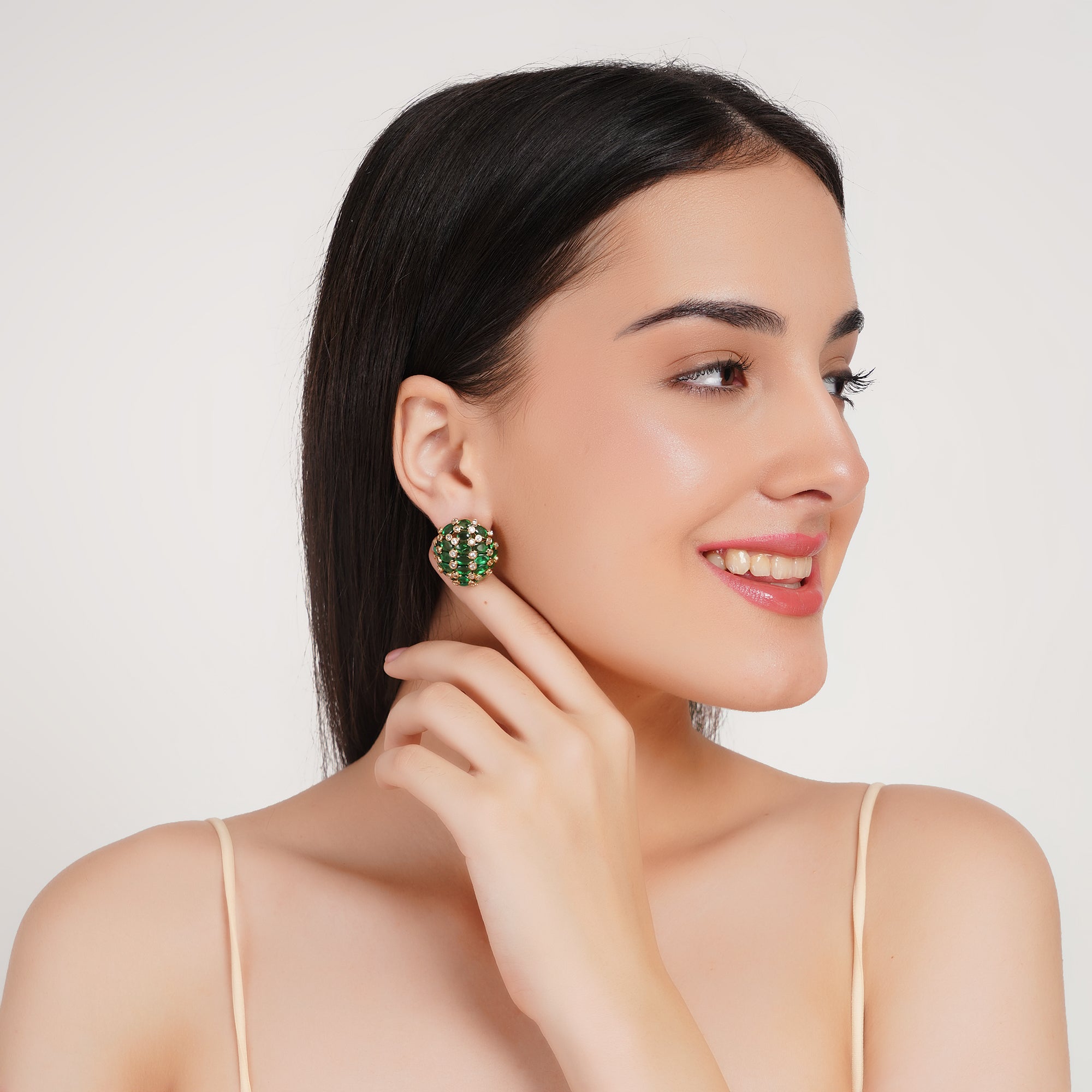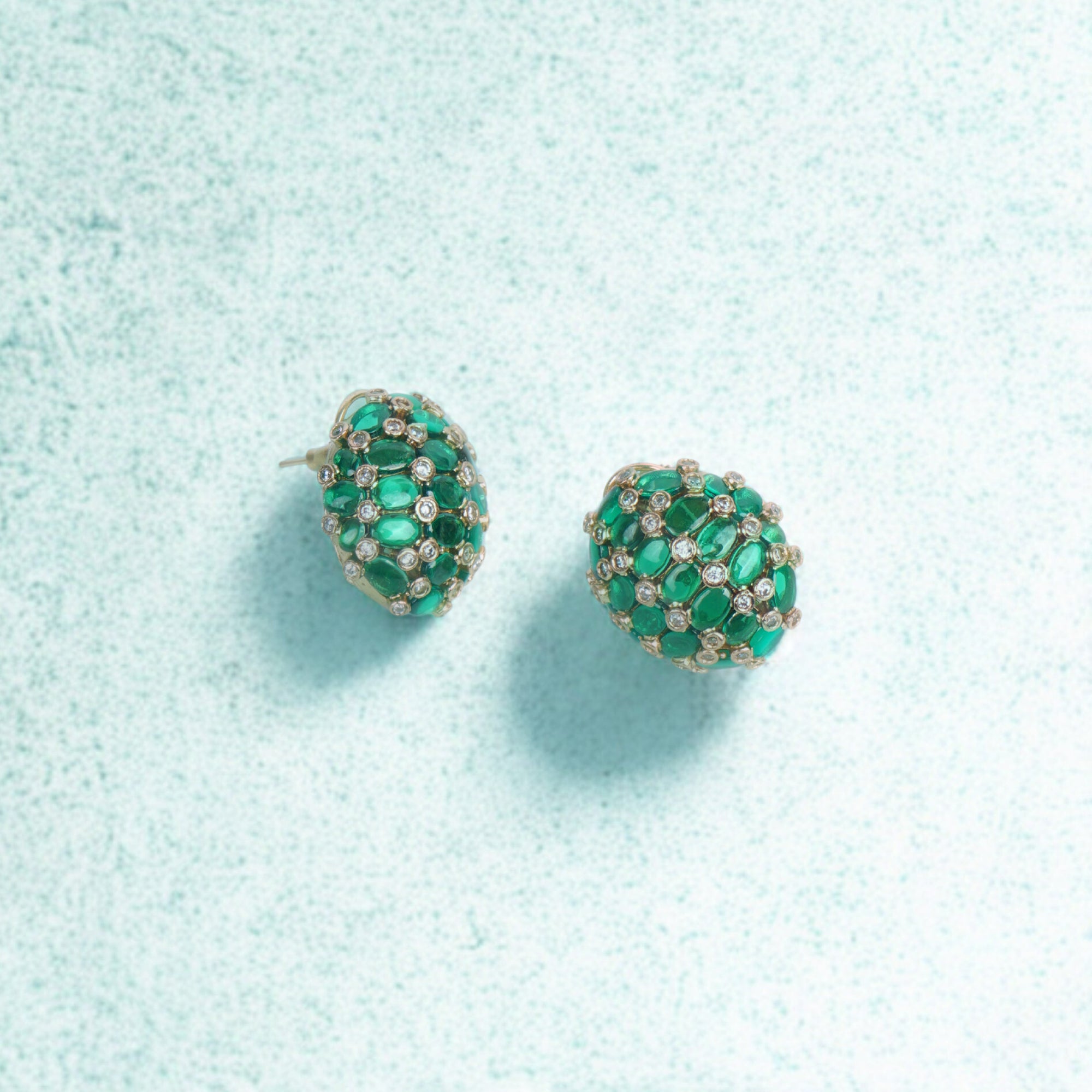 Brighten your style with these exquisite dome-shaped stud earrings, featuring a cluster of vibrant emerald green stones beautifully set in a patterned gold finish. Accented with delicate sparkling details, these dome studs blend traditional elegance with a touch of modern flair. Perfect for festive occasions, office parties, or everyday wear, they promise to add instant sophistication to any outfit while ensuring lightweight comfort and a secure fit.