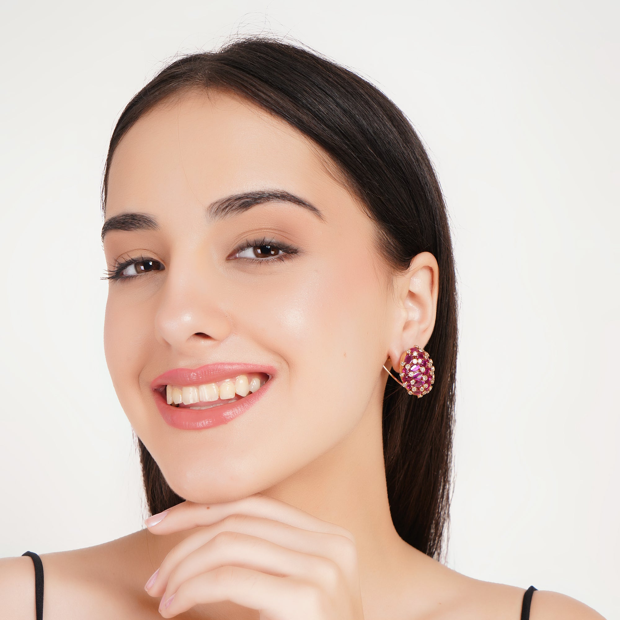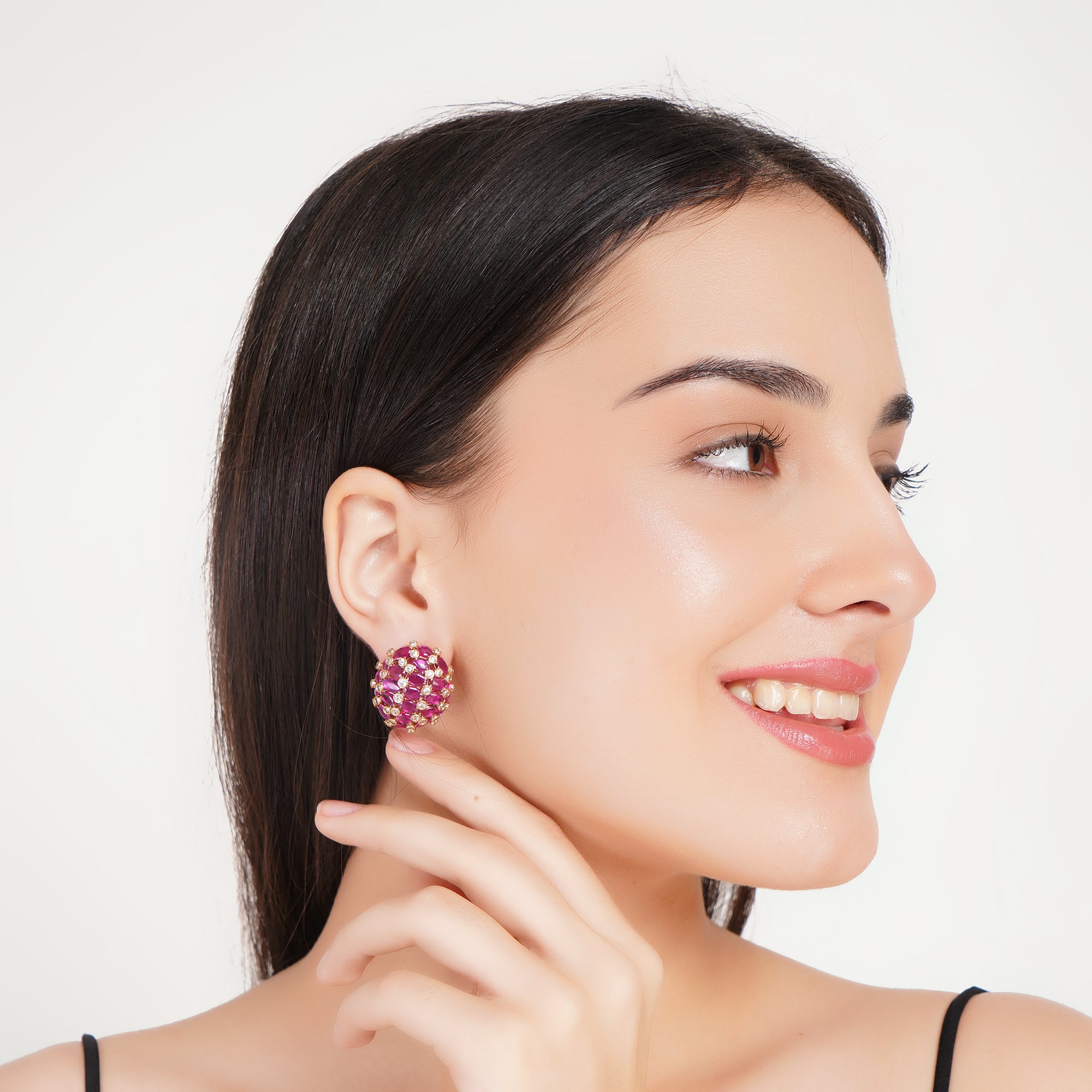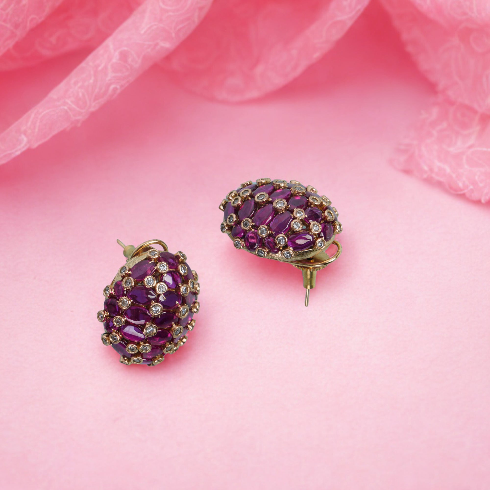 Brighten your style with these exquisite dome-shaped stud earrings, featuring a cluster of vibrant emerald green stones beautifully set in a patterned gold finish. Accented with delicate sparkling details, these dome studs blend traditional elegance with a touch of modern flair. Perfect for festive occasions, office parties, or everyday wear, they promise to add instant sophistication to any outfit while ensuring lightweight comfort and a secure fit.