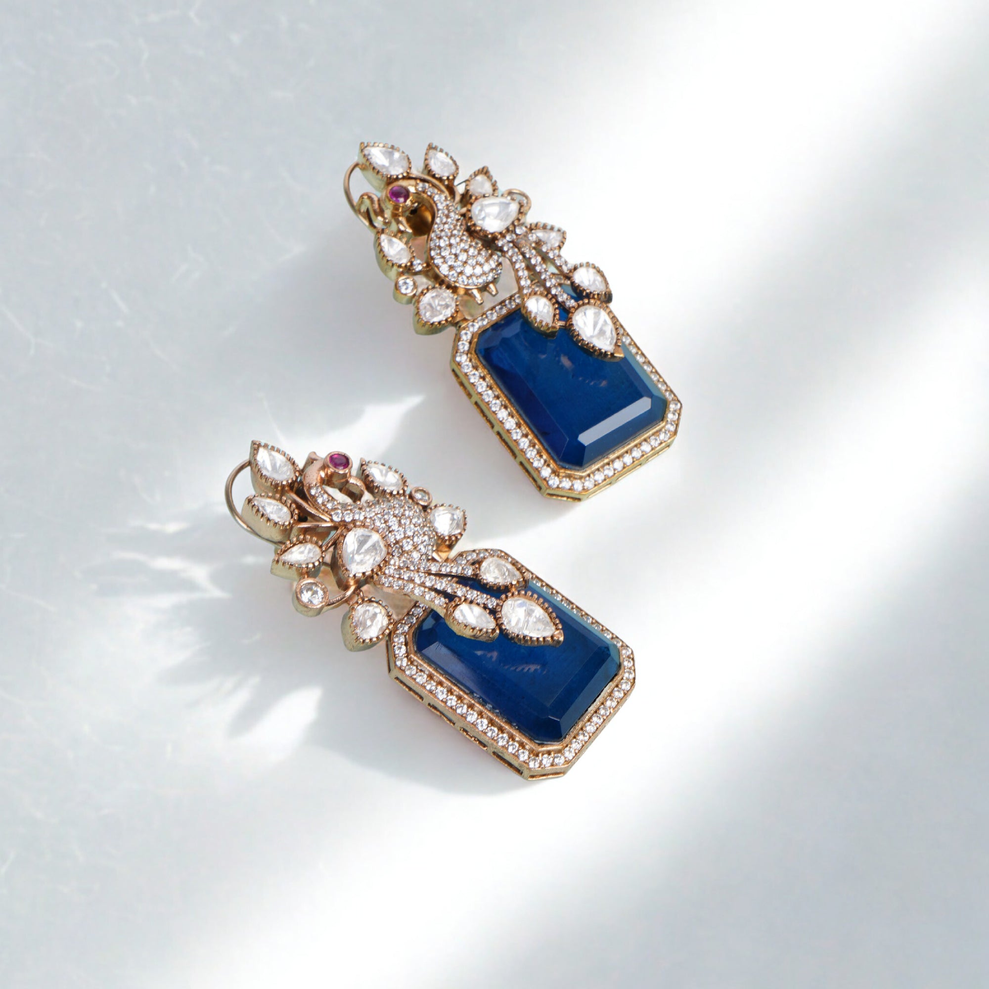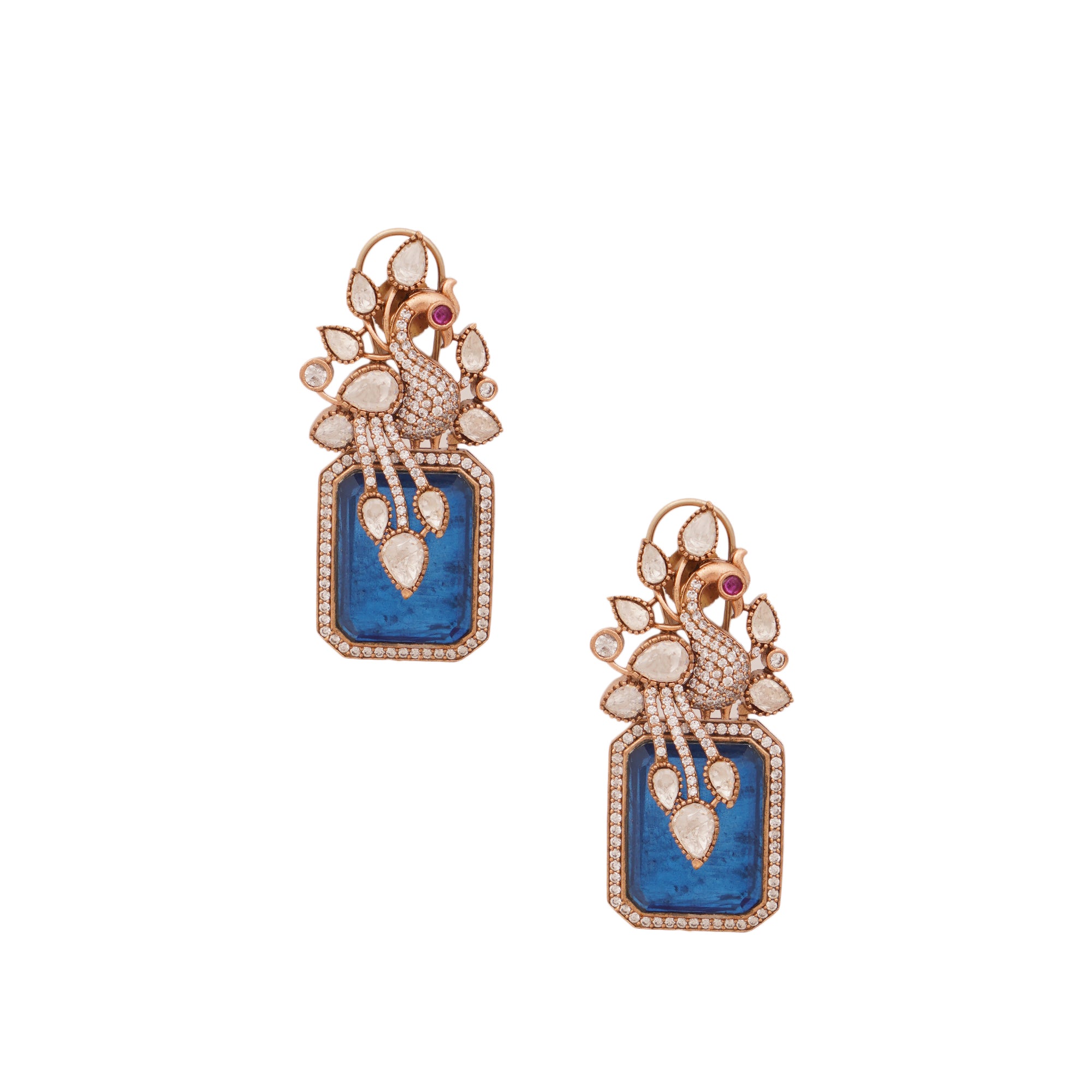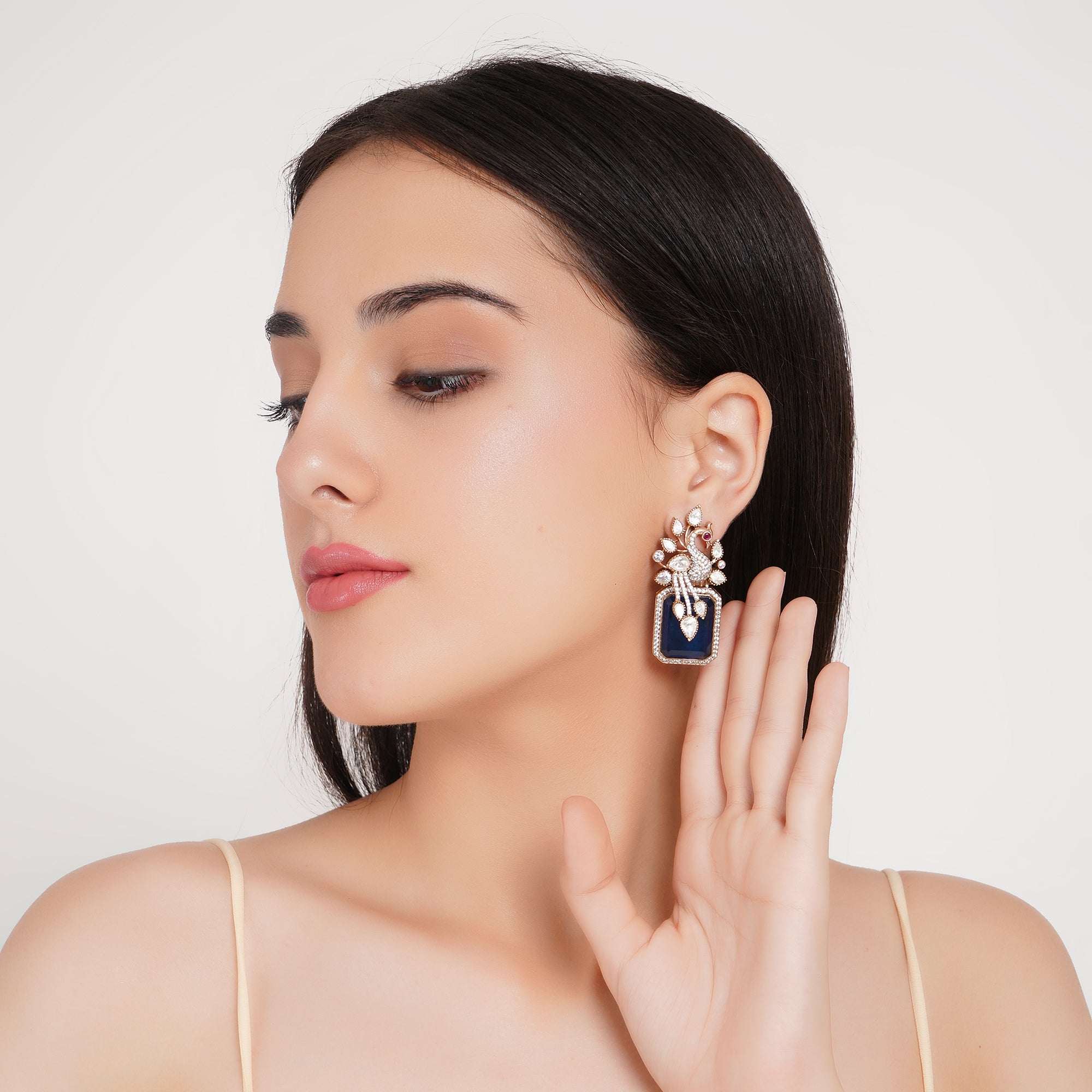 Luxury Peacock Design Earrings, Rose Gold, Blue Gemstone with Crystal Accents