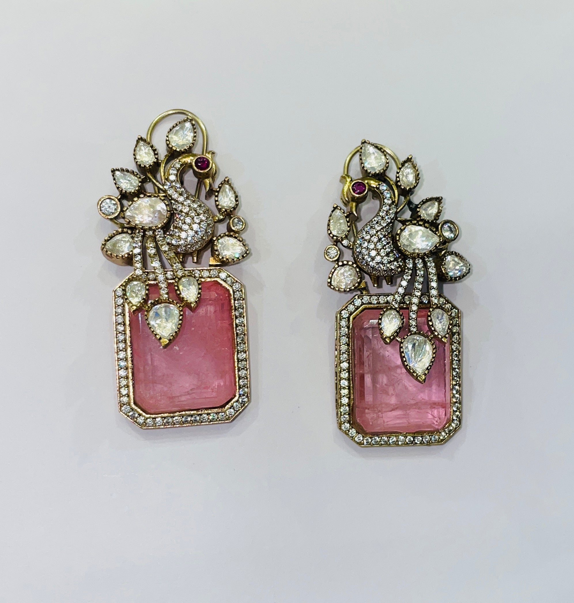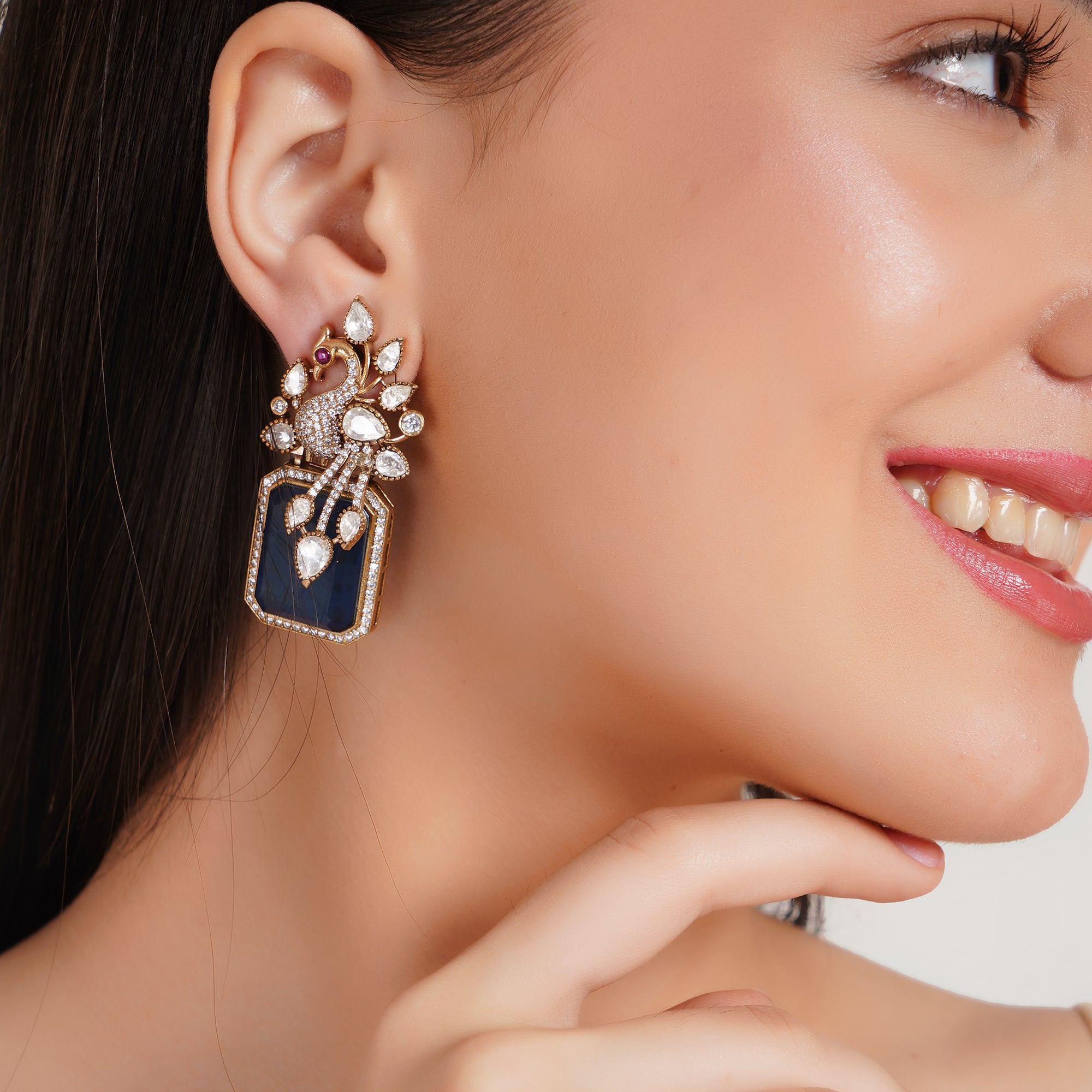 Make a regal statement with these exquisite peacock-inspired earrings that blend traditional Indian artistry with contemporary elegance. The stunning design features magnificent blue gemstone centrepieces, beautifully framed in luxurious rose gold plating. Each earring showcases intricate peacock-motif detailing adorned with sparkling crystal accents that catch and reflect light from every angle. The ornate framework combines teardrop-shaped elements arranged in an artistic pattern, reminiscent of peacock plumage. These statement pieces feature a harmonious mix of deep blue gemstones and clear crystals,...