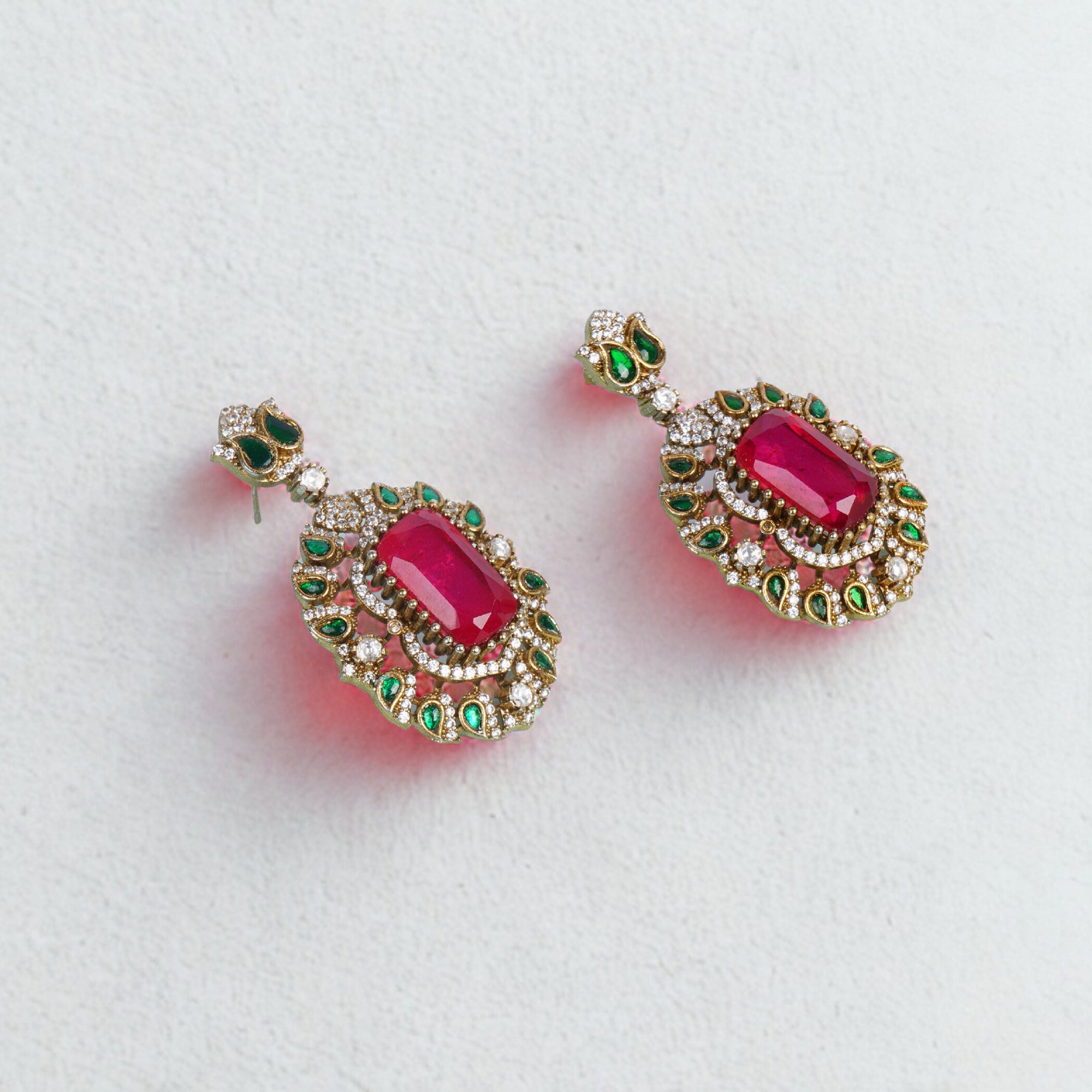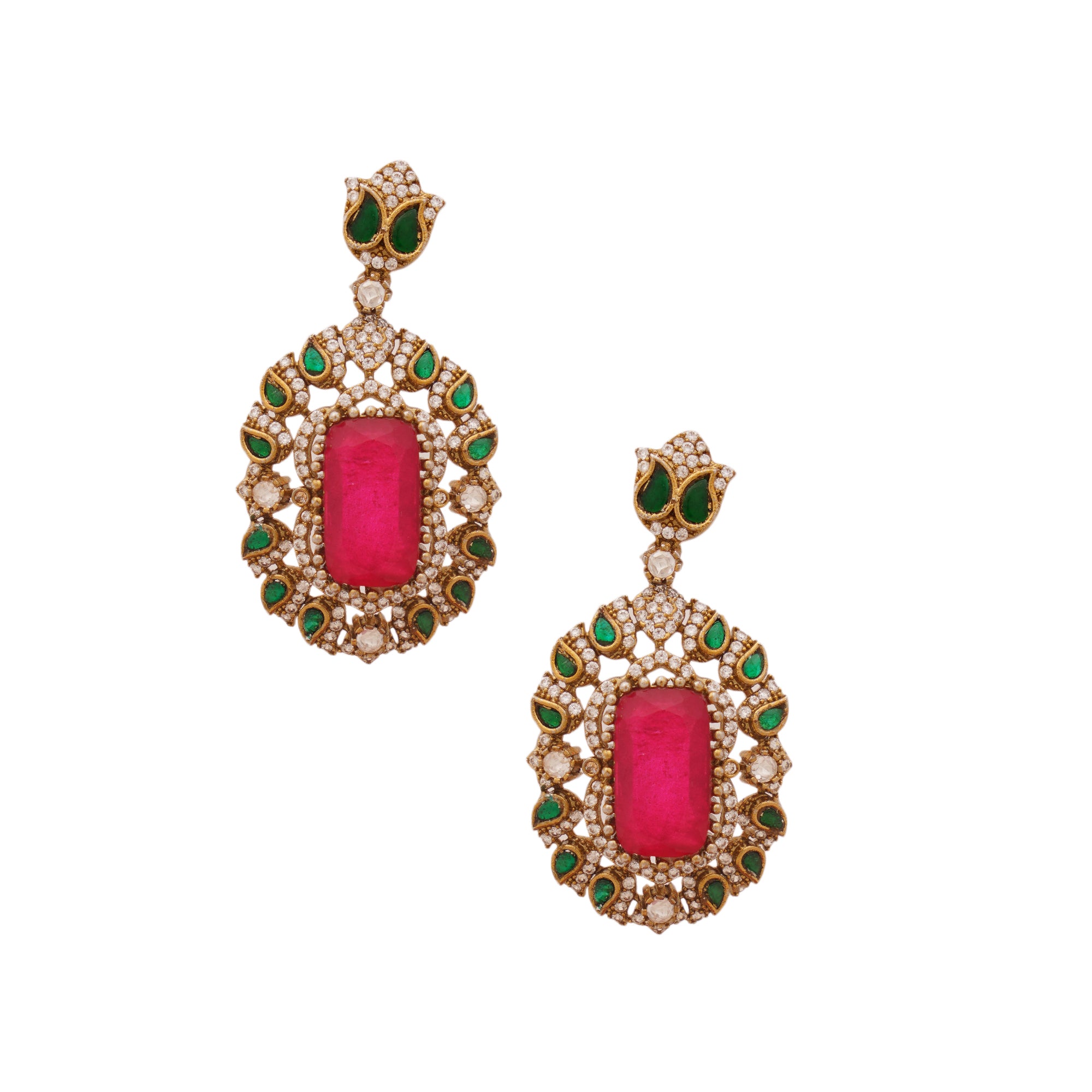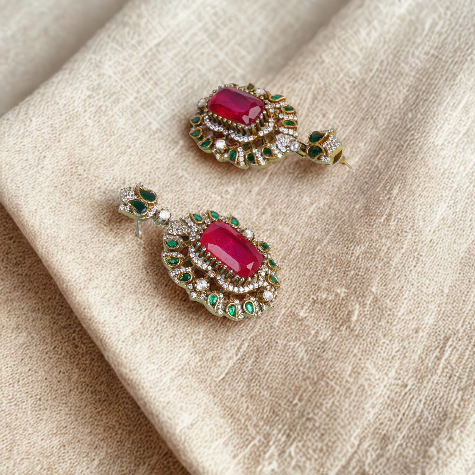 Add a regal touch to your ensemble with these stunning earrings featuring bold ruby red stones at the center, surrounded by sparkling white kundan and intricate green accents. These statement pieces are expertly crafted with an elegant oval design, combining traditional charm and modern sophistication. Ideal for weddings, festive occasions, or any celebration where you want to stand out. Lightweight and comfortable to wear, these earrings will instantly elevate your look and complement both ethnic and fusion outfits