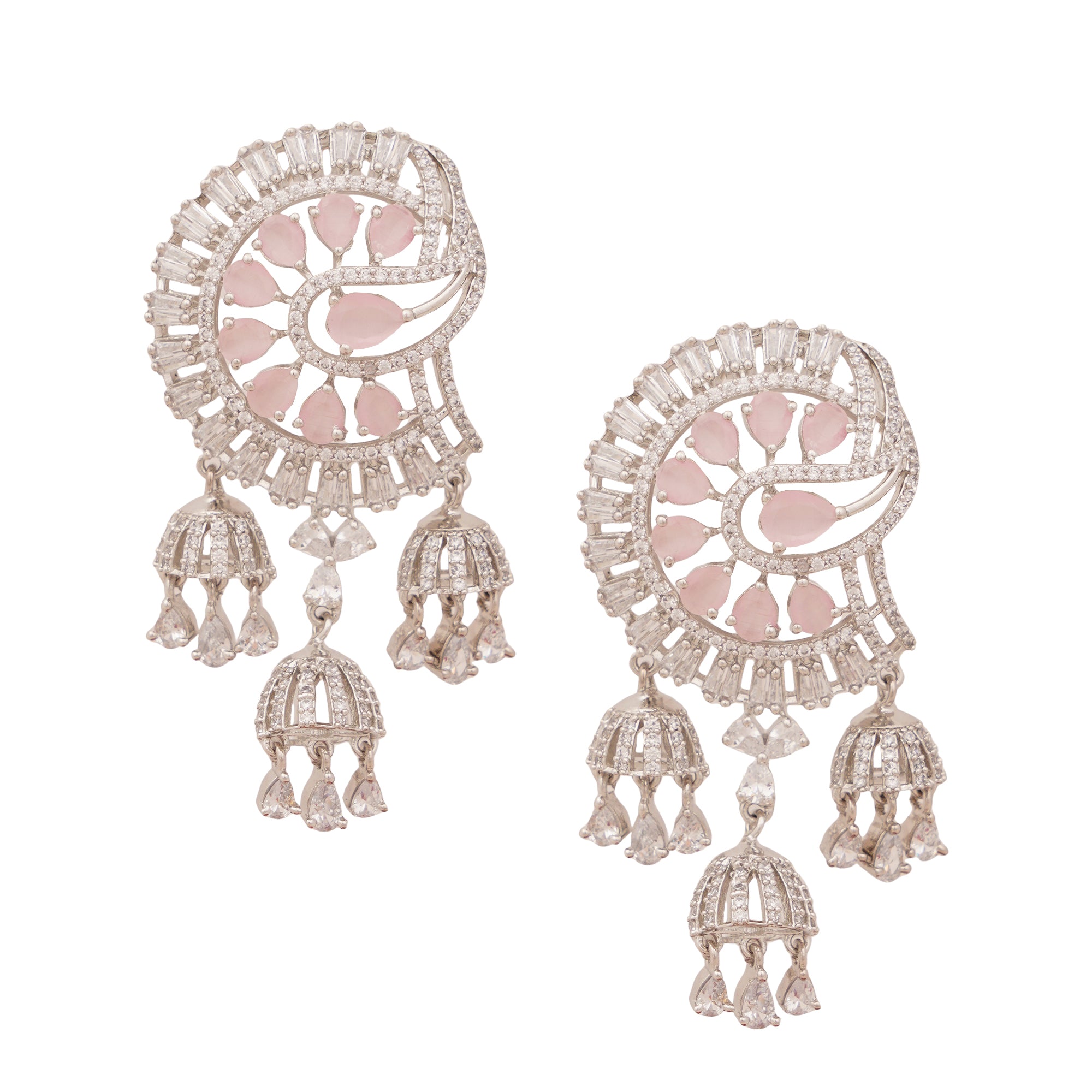 Stunning chandelier-style drop earrings featuring pink quartz stones surrounded by brilliant cubic zirconia in a sophisticated fan pattern
